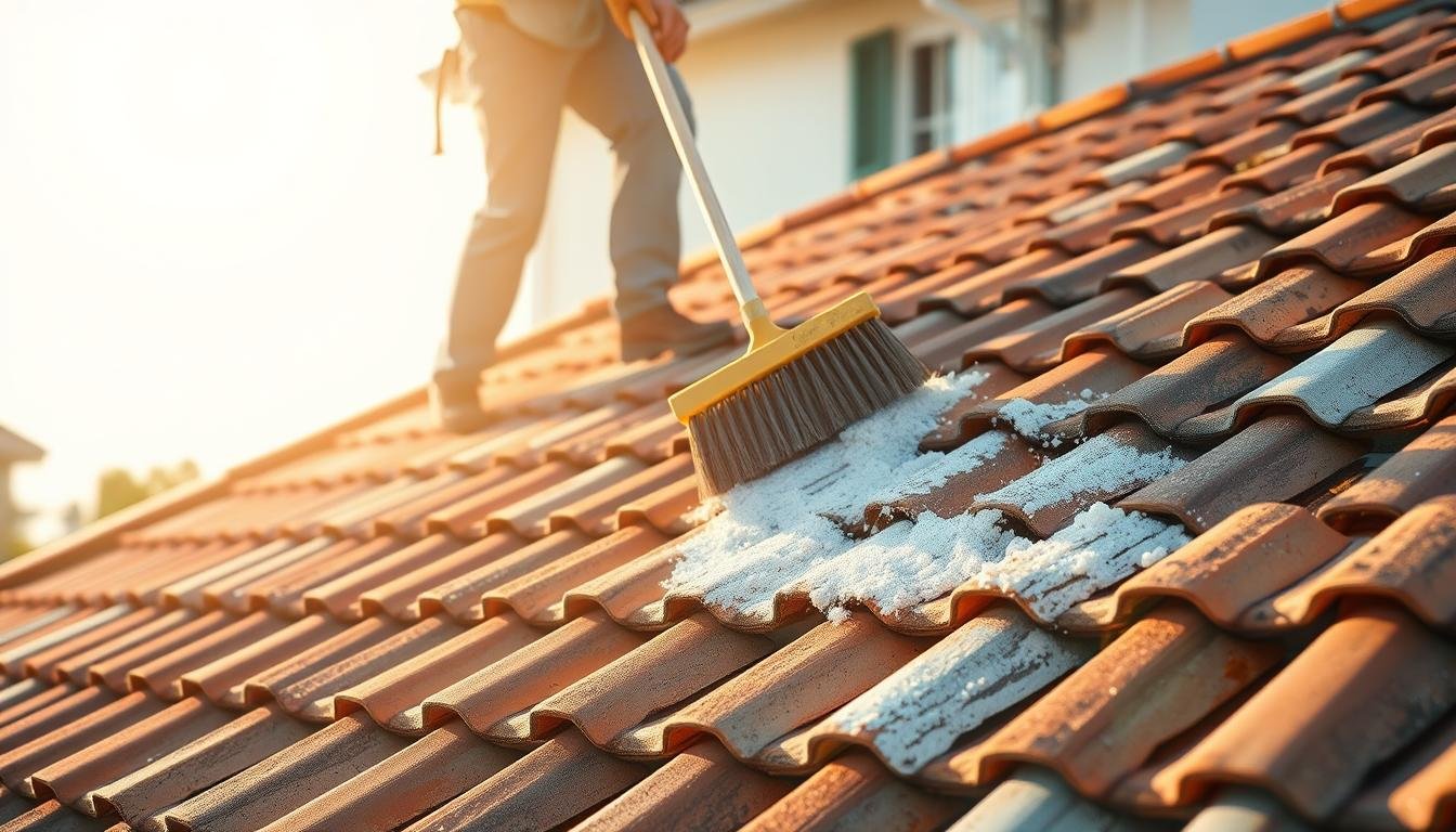 For tough moss and black algae, you need special cleaning solutions. These solutions aim to kill the stains without harming your roof. It’s important to pick a solution that fits your roof type.